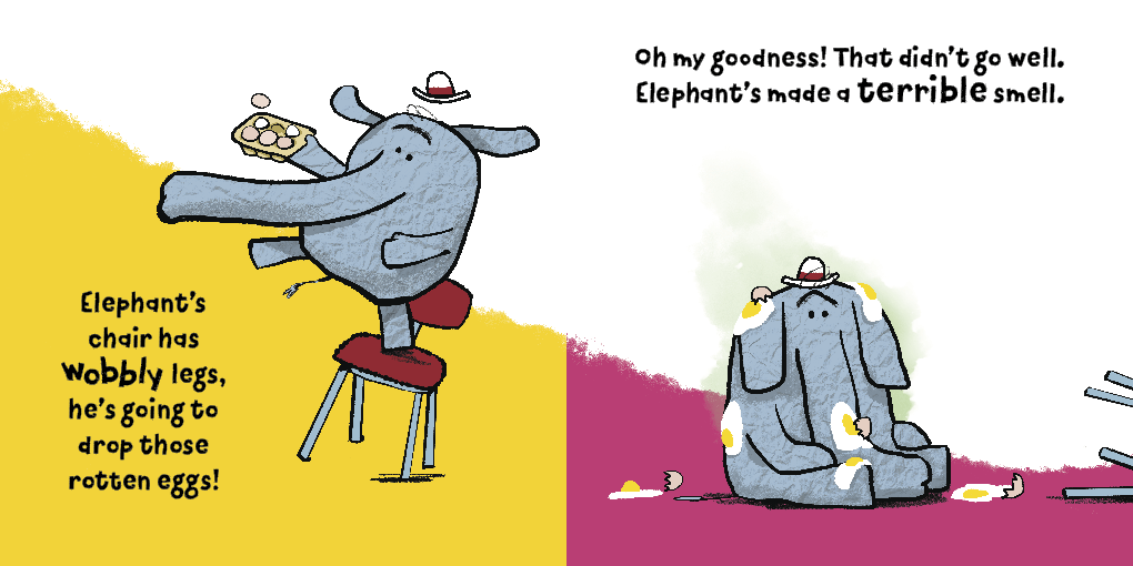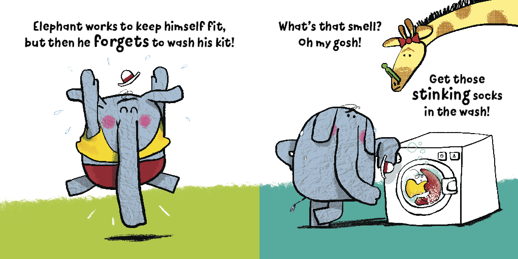 Join Elephant and his friends on a particularly pongy journey. If it’s not rotten eggs or smelly green slime, then it’s onion breath and stink socks. Energetic rhyming text will delight young children who will love the colourful animal characters and they’ll laugh out loud at the final smell of the book!